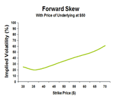 (3) Forward Skew : ATM 내재 변동성을 중심으로 우측 내재 변동성이 높은 형태를 보임. Reverse Skew 와 주요요인은 동일하고, 시장에 큰 충격이 발생할 경우 기초자산이 상승 할 것을 대비하여 OTM 콜 옵션(=OTM Payer Swaption) 또는 ITM 풋 옵션(ITM Receiver Swaption) 매수 수요가 클 경우 발생함.
