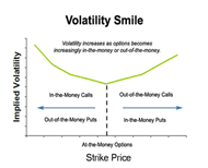 바닐라 콜/풋 옵션 평가를 위해 널리 사용되고 있는 블랙-숄즈 모형은 모든 행사가(또는 기준가격(ITM, ATM,OTM))에서 내재변동성은 동일하다고 가정함. 단, 1987년 시장의 큰 충격이 발생(블랙먼데이)한 이후 내재변동성이 동일하다는 가정이 무너짐과 동시에, 옵션의 내재변동성이 행사가에 따라 스마일/스큐 형태를 띄고 있음을 인지하게 됨. 이후 다년간 스마일/스큐 현상을 반영할 수 있는 대안을 연구하고 있으나, 대부분의 하우스들은 블랙-숄즈 모형을 그대로 사용하거나 일부 수정하여 사용하고 있음.